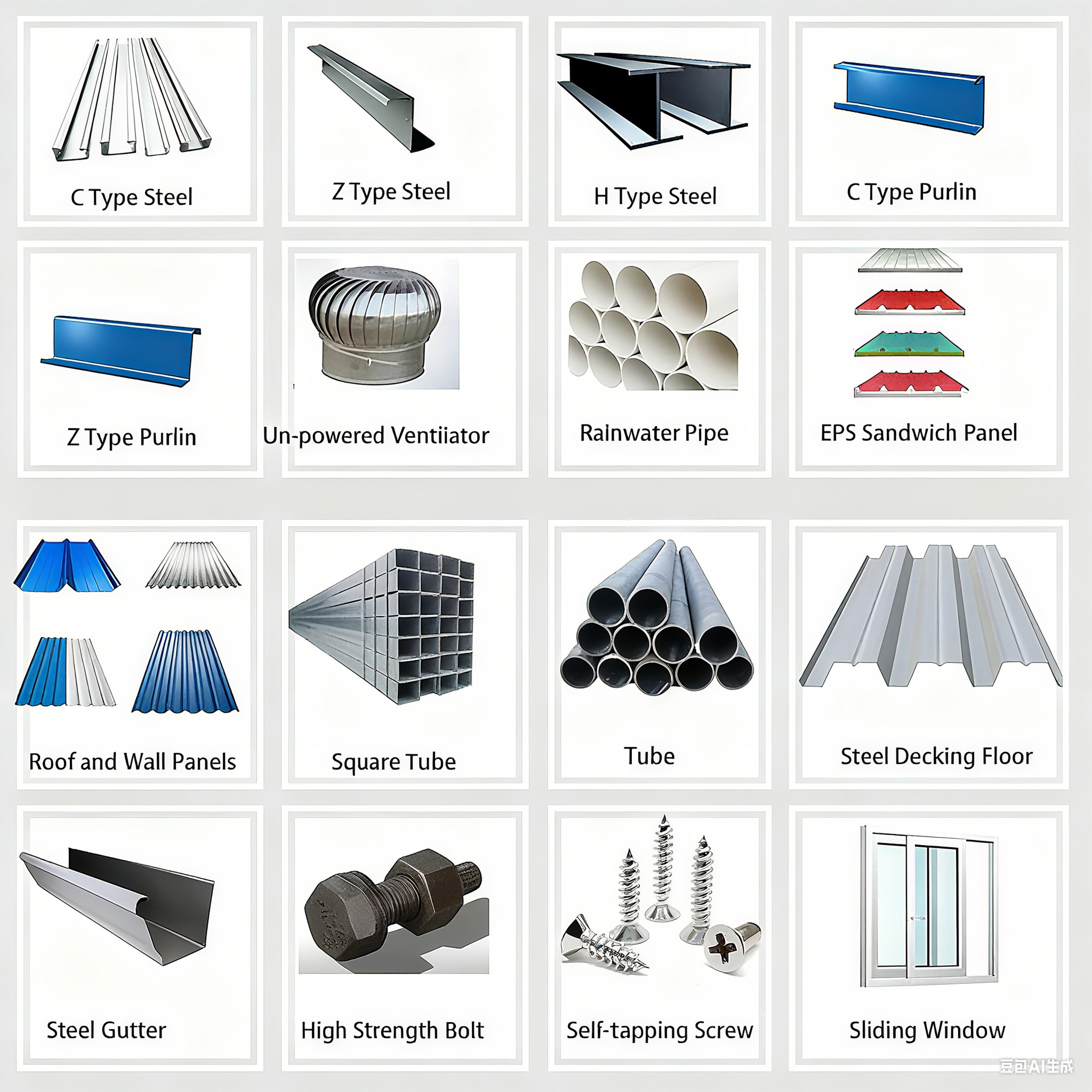 Roof and Wall Panels: Various colors, waterproof and corrosion-resistant, for both appearance and protection.