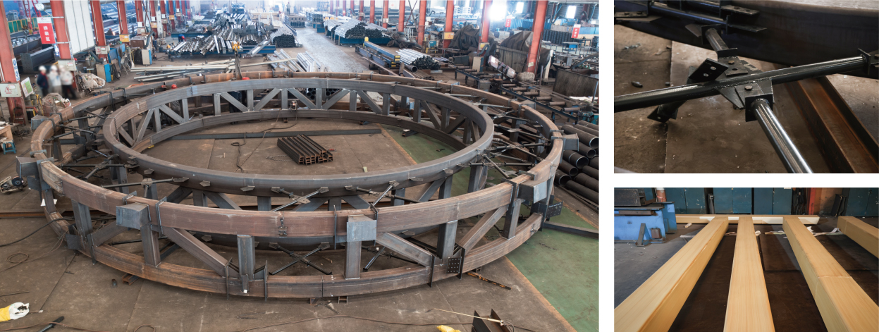 The project as a whole is a complex three-dimensional curved surface modeling, covering an area of more than 2,200 square meters, the top elevation of 8.9 meters, the height of the eaves structure of 4 meters, the total amount of steel structure 200 tons. Its core design highlight is a 14-meter diameter ring daylighting roof, extending outward through a spiral radial layout, with a maximum radius of 28 meters.The inner and outer ring structure adopts rectangular square pipe bending technology, in which the outer ring is precisely spliced into a circle by 8 custom-made curved steel beams, and the center ring adopts hot bending technology to achieve high-precision curved surface modeling.